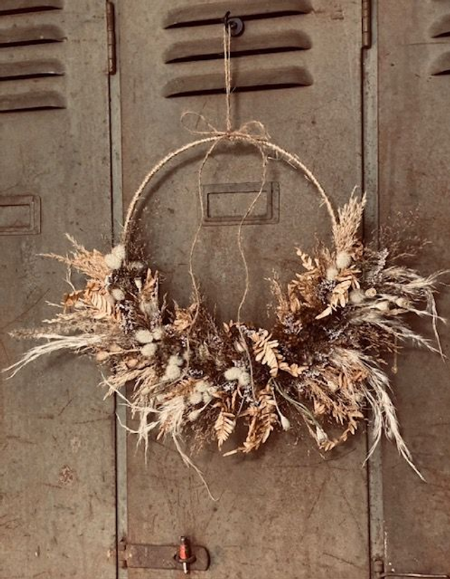 Materiaaleina käytämme koristeellisia heiniä, kuivakukkia ja erilaisia lehtiä.